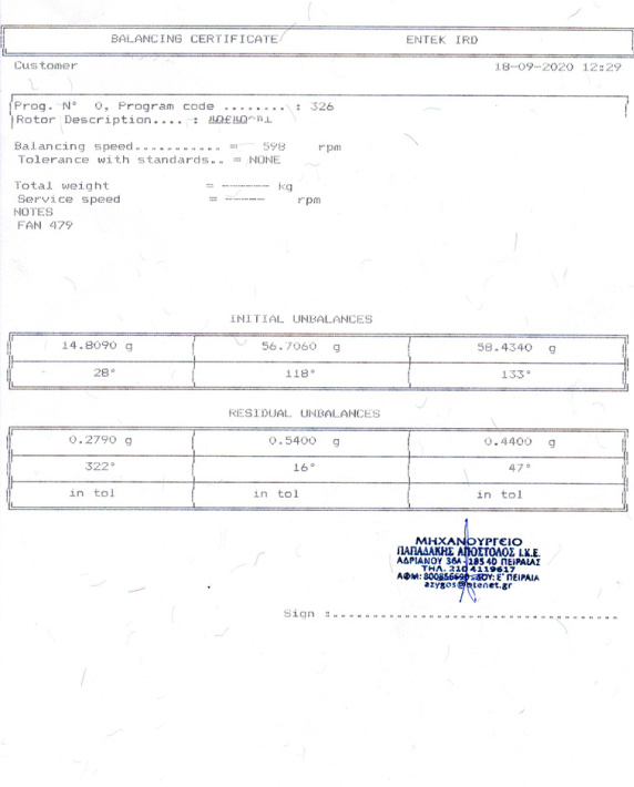 Η εταιρία μας πραγματοποιεί δυναμική ζυγοστάθμιση μέχρι βάρους 6.000 kgr με έκδοση πιστοποιητικού Α4(balance certificate),με αναλυτικές ενδείξεις προ ζυγοστάθμισης και μετά ζυγοστάθμισης (initial unbalances/residual unbalances) σε μικρά η μεγάλα αντικείμενα όπως :